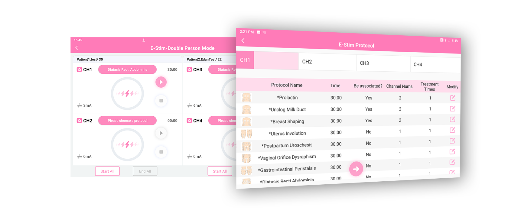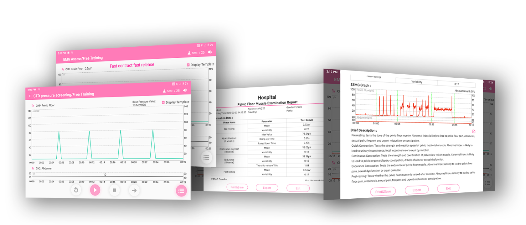la terapia del suelo pélvico y la rehabilitación posparto con 4 canales independientes de estimulación eléctrica y adquisición de EMG y 1 canal de presión.