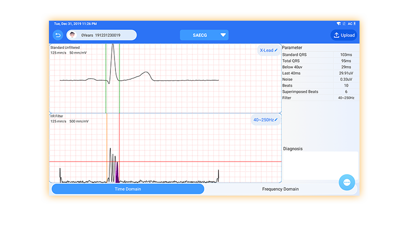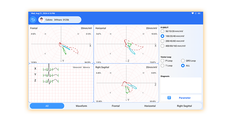 Se puede amplificar y medir cualquier forma de onda. Se puede editar y confirmar cualquier informe.Se puede seleccionar y comparar el historial de informes. .